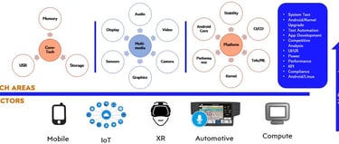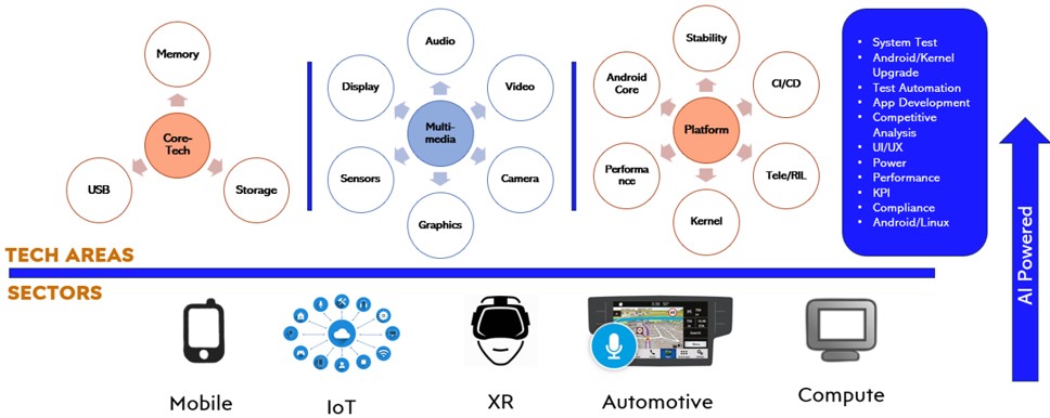 Expertise in performing manual and automated functional testing for Android based devices covering Kernel, Security, Android Core, Audio, display, Camera, Sensors, Gfx, Storage, USB, Telephony, Power and Performance for Mobile, XR, IoT, Auto and compute.